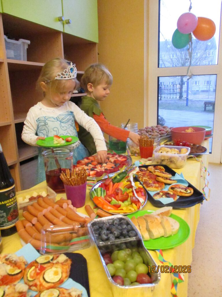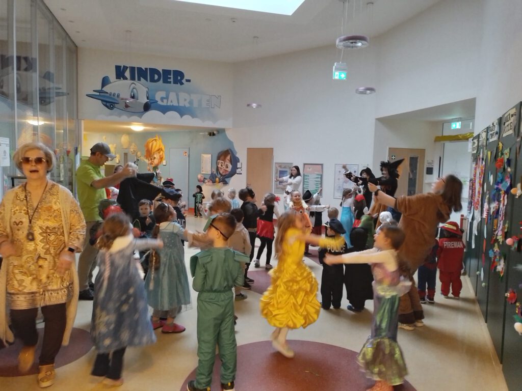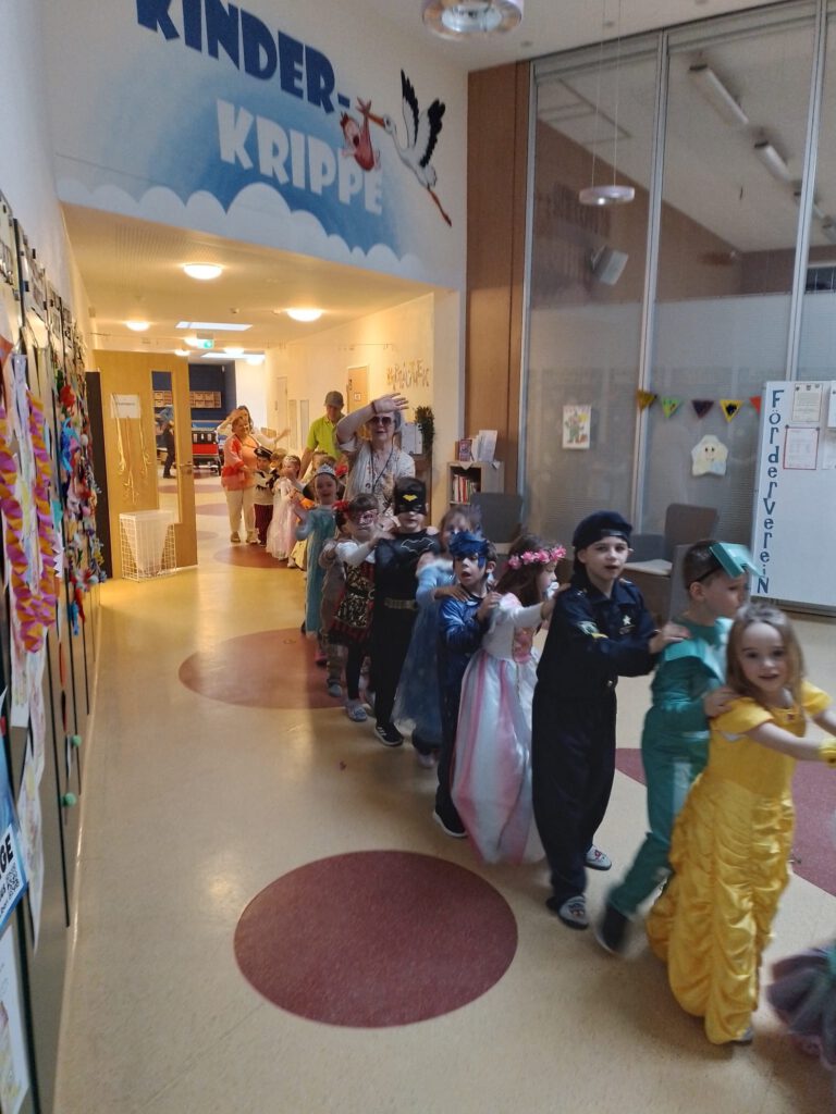 Am 12.02.2026 feierten wir mit lauter Musik und tollen Kostümen ein aufregendes und großartiges Faschingsfest. Tage vorher wurde fleißig die farbenfrohe Faschingsdekoration gebastelt. Jede Gruppe konnte sich an einem bunten und vielfältigen Buffet für den Tag stärken. Mit einem großen Begrüßungskreis, wo alle Kinder und Erzieherinnen ihre einzigartigen Kostüme präsentieren, begann die kunterbunte Faschingssause. Bei passender Musik, leckerem Essen, einer Polonäse durch die KiTa, viel Spaß und guter Laune tanzten sich die Kinder durch diesen besonderen und aufregenden Tag.