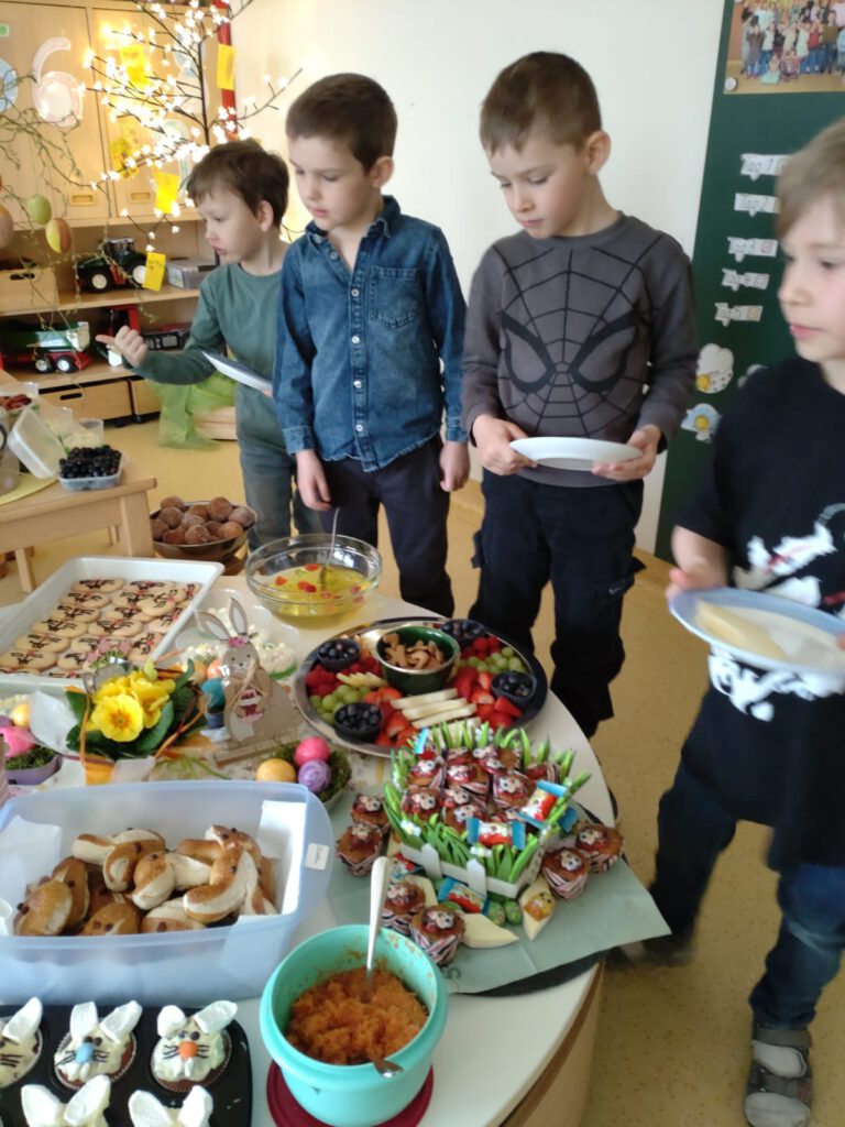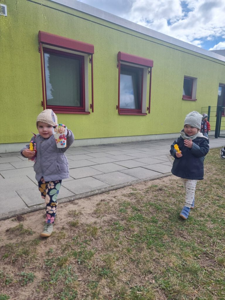 Die Kinder unterstützten den „Osterhasen“ mit selbstgebastelten Osterkörbchen und gefärbten Ostereiern. Während sich die Kinder bei einem leckeren Frühstück stärkten, versteckte der Osterhase kleine Überraschungen auf unserem Spielplatz.